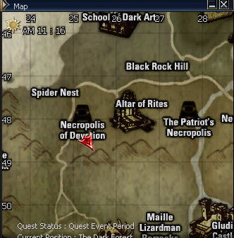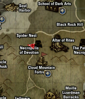 9) The obelisk is near the Spiders nest port and right near the Necropolis of Devotion. Basically you speak to the Mysterious Elf several times and she spawns three set of mobs. The first are three dagger Leto Lizardmen, then three Lizardmen archers, then an overlord and two shamans. You may want to bring a helper with but it should be soloable with decent gear and shots.
