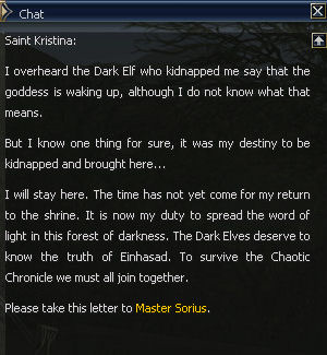 10) Find the real Saint Kristina a little south east of where you were. She sends you back to Gludio to talk to Master Sorius again.