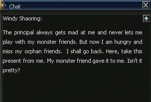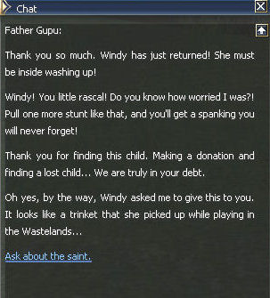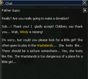 4) At the orphanage you will speak to Father Gupu who asks if you'll donate that magical 100k amount. Now I know no one wants to pay that, so I did just to see what would happen. From old guides it looks like if you don't pay it you skip the whole Windy part, but this quest is so amazingly linear the difference in steps shouldn't be a problem. He tells you to find Windy.