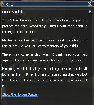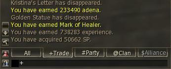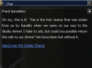 12) Speak to Bandellos back in the Giran Temple and give him the Golden Statue. He will give you the Mark of Healer, 134,839 exp and 50,000 sp.