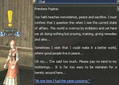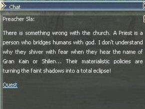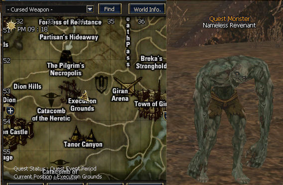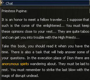 1. The quest begins at Giran castle town with Priestess Pupina. She sends you off to collect 7 scroll pieces at the Execution Grounds. You will get 60 dimension diamonds at this point too, more than enough to use to port to every town. Trade them at the gatekeepers in town.