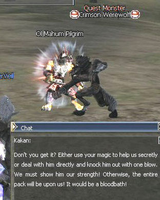 12. A Crimson Werewolf quest mob spawns and starts to fight with the Pilgrim. Kakan says something cryptic about using magic or taking him out with one blow. I'm not sure what that means but in old guides it says to only use magic to attack the werewolf, however I just attacked it with a weapon and it was fine. Again if you mess up, kill the Pilgrim and do it over.