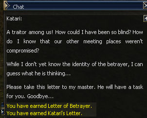 9. Talk to Katari. You will receive her letter and letter of betrayer. If you happen to mess this up at all, to start over you have to kill the Pilgrim then speak to Katari again.