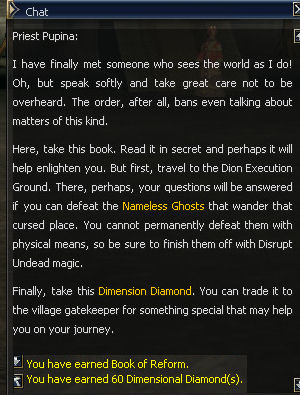 19. He sends you back to Sla at ,the Plains of Dion where the quest ends. You earn Mark of Reformer, 164,032 exp and 17,500 SP