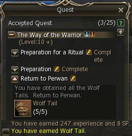 The quest item acquisition rate is about 1 for every 2 Werewolves killed. When you have the 5 Tails, return to Perwan in the Cave of Souls.
