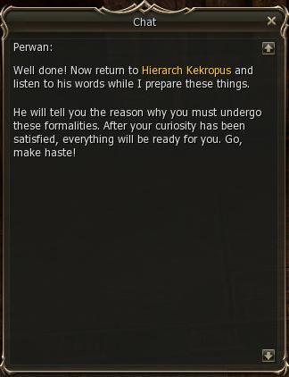 5) Perwan sends you to Kekropus in the village, who then sends you back to Perwan.