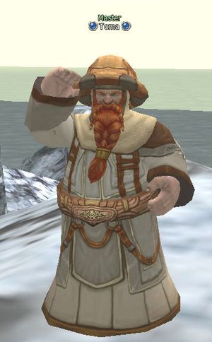 Master Toma is located along the northern shore near the Western Mining Zone northeast of Dwarven Village.