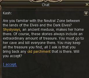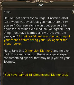 1) This quest starts in Dion behind the Warrior Guild with Kash. He gives you 61 dimensional diamonds and asks you to kill Shyslyssys.