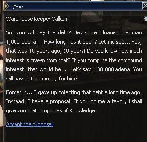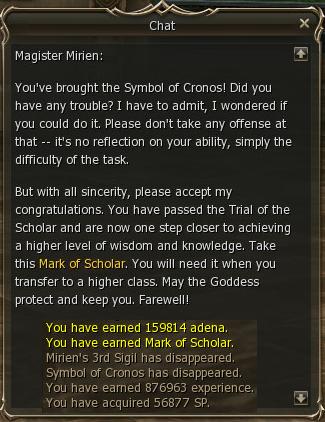 37) In Dion talk to Mirien and you're DONE! The reward used to be Mark of Scholar, 80,2665 exp and 30,000 SP, nowadays it's Mark of Scholar, 159,814 adena, 876,963 exp and 56,877 SP.