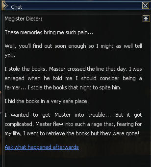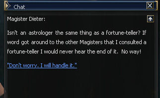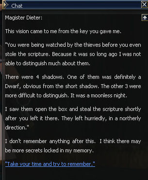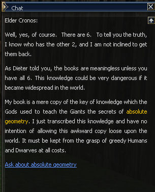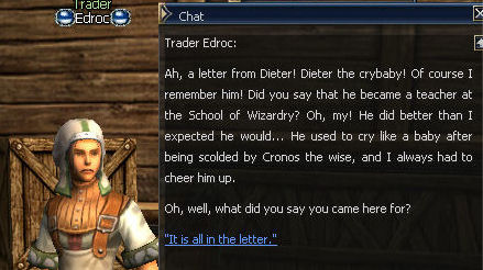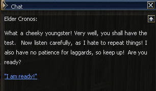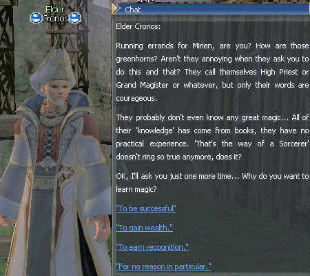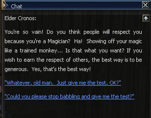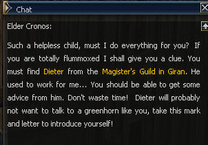 21) Cronos is to the left of the Gatekeeper, and you are forced to be rude to him but he calls you cheeky twice so fair's fair. Then it's back to the Magic Guild in Giran, this time to Magister Dieter.