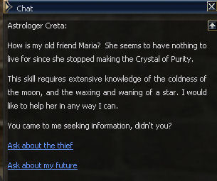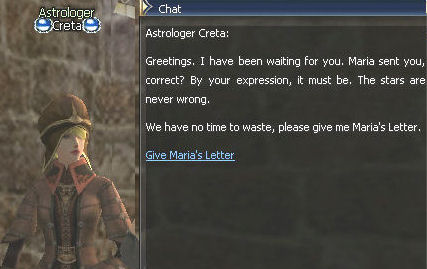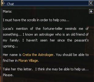 5) Maria sends you to Floran Village to see Astrologer Creta. Take a deep breath, this is a LONG quest.
