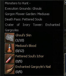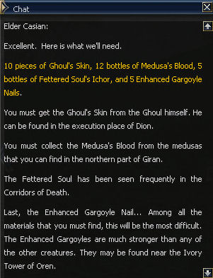 34) You need 10 Ghoul Skins, 12 Medusa's Blood, 5 Fettered Soul Ichor, and 5 Enchanted Gargoyle Nails. Only Medusas are aggro, you can find the mobs in the following locations. When you have all the parts return to Casian.