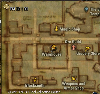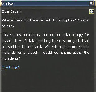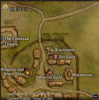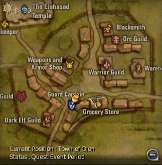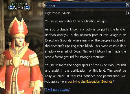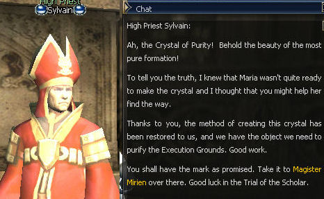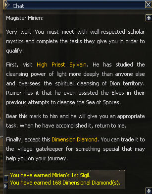 1) This quest starts in the Einhasad Temple in the Town of Dion, with Magister Mirien. She gives you 168 dimensional Diamonds and sends you to High Priest Sylvain. Trust me, you'll want to use as many as those diamonds as possible with this quest.