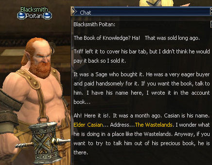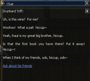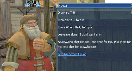 27) Walk over to the Harbor and Drunkard Triff (/target Triff) is along the left side of the Harbor across all the walkways, all the way to the back. He sends you off to find two people, Blacksmith Poitan in Dion and Warehouse Keeper Valkon in Giran.