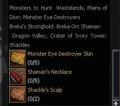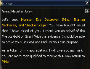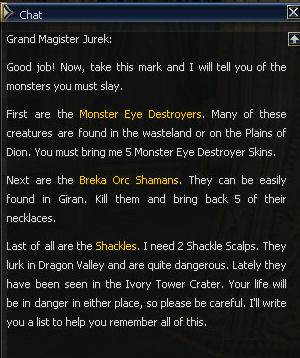 18) You'll need 5 Monster Eye Destroyer Skins, 5 Breka Orc Shaman Necklaces, and 2 Shackle Scalps. Once you have all this go back to Jurek in Giran. Monster Eyes and Shackles can be found around the Plains of Dion, and the entrance to Dragon Valley off Death pass, respectively.