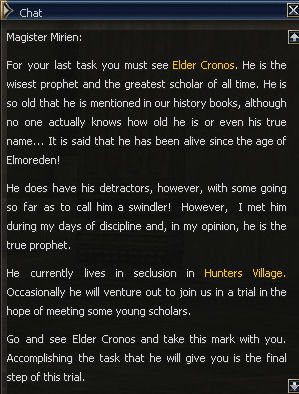 20) Mirien asks if you are ready for the final challenge, and it's a shame that "you're kidding right?" isn't an option. She sents you to Elder Cronos in Hunters Village.