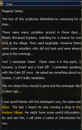 24) Dieter sends you to Hunters Village to see Edroc in the Weapons and Armor shop.