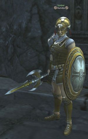 Soldier Kunota is located in the Keucereus Alliance Base in the sky in Gracia. He stands near the wharf for the airships in Gracia, but warns that leaving the protection of the Barrier Orb is dangerous.